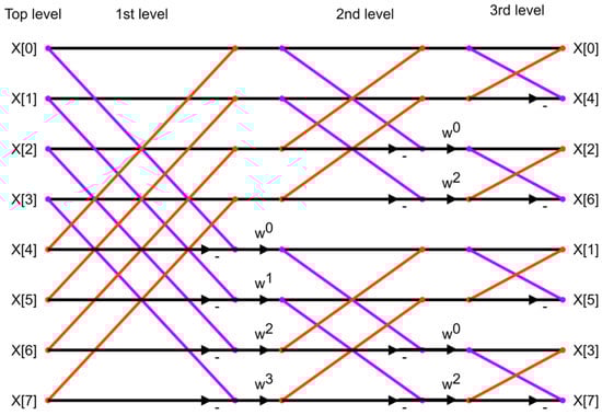 Figure 7 illustrates the process of NTT (Number Theoretic Transform) computation when . As the value of increases, an additional computation stage is added. By arranging the elements that perform identical operations into a single register, parallel implementation becomes possible. In this regard, Figure 7 provides important information.