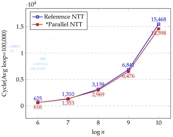Comparison of Reference and Parallel NTT: This graph compares the performance of the Reference NTT (blue) and the *Parallel NTT (red) based on the average number of cycles over 100,000 loops. As increases, the Parallel NTT consistently shows lower cycle counts compared to the Reference NTT, demonstrating its efficiency, especially at higher values of .