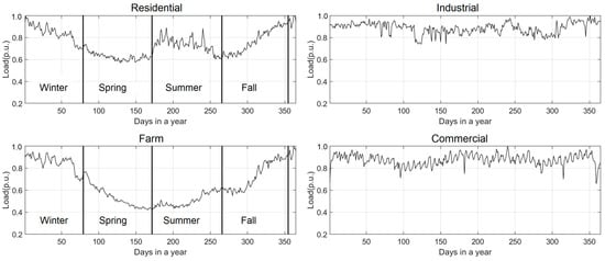 The initial step of the methodology requires identifying the major electricity customer categories based on their end-use applications. Residential, industrial, commercial, and farm customers were identified as the major categories in the Province of Saskatchewan. Historical hourly variations of the load data for each identified customer sector are shown in Figure 4 per unit of the respective peak values. The annual load profile for each sector was then divided into periods having similar diurnal load profiles. Figure 4 shows that the residential and farm sectors were divided into four seasonal periods since the diurnal load profiles for these customer sectors had reasonable similarity as assessed from (2). The diurnal load profiles of the industrial and commercial sectors were found to be similar throughout the year.