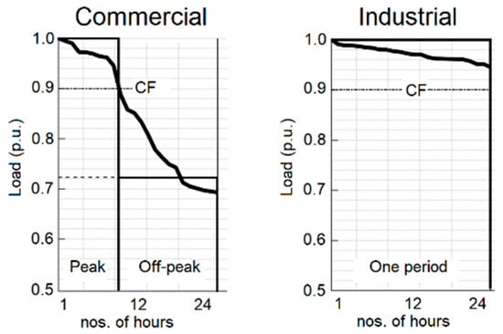 The next step is to observe the diurnal load variation in each period and further subdivide it into peak and off-peak periods. Figure 5 shows the subdivision using a cut-off factor of 0.9 per unit of the peak load in that period. The figure shows that the commercial sector is divided into two periods that are represented by the peak and average loads in the respective periods calculated using (5) and (8), respectively, and the probabilities of encountering the two periods are calculated using (6) and (9), respectively. Figure 5 also shows that diurnal variation in the industrial load is insignificant, and, therefore, was not subdivided.