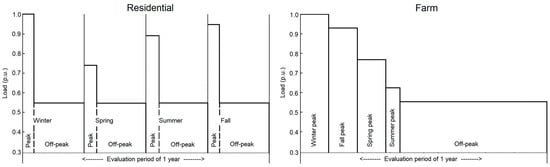 Figure 6 shows the diurnal load profiles for the residential and farm sectors in the four seasonal periods. The seasonal periods for the residential and farm sectors are similarly further subdivided into peak and off-peak periods as shown in the figure. The representative load and its probability are similarly calculated using (5) and (6), respectively.