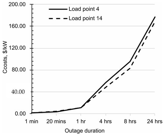where, icp,t is the interruption cost in CAD/interruption for an outage of duration t during the load period p. The outage duration, t = 1, 2, …, T, representing 1 min, 20 min, 1 h, 2 h, 4 h, 8 h, 24 h [14,15,16,41,42] are usually considered in these studies.