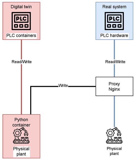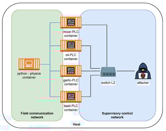 The digital twin is a virtual model of the food processing plant, with all containerized PLCs connected to a simulation of the physical processes. Each PLC in the physical plant was replicated in a Docker container by cloning the PLC logic into Python scripts, which were then interconnected using the pyModbus library [40]. This containerization allowed for isolation and portability, facilitating the replication of the PLC’s behaviour in the virtual environment. The containers were configured to expose their Modbus interfaces to enable communication with the different components. These PLCs were connected to a virtual model of the food processing plant developed in Python by modeling physical components such as the mixing tank, sensors, and actuators. The model was designed to accurately replicate the behavior and interactions of these components, ensuring that the digital twin’s operations closely mirrored those of the real plant. This simulation environment was continuously synchronized with the actual plant through a proxy system. The proxy was positioned between the real hardware PLCs and the physical plant, transparently forwarding all Modbus traffic from the PLCs to the real plant. When a write operation is detected, the corresponding command is transmitted by the proxy to the replicated physical container connected to the digital twin, ensuring that both the virtual and physical systems remain in a consistent state. This setup allows an accurate model of the real plant to be maintained without directly interfering in its operations.
