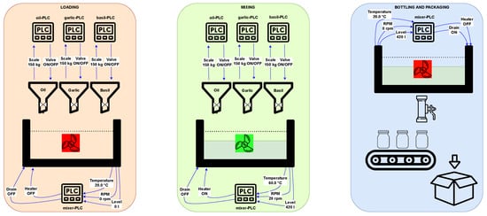 The production cycle for pesto lasts approximately 17 min and is composed of nine distinct steps. This process begins with the loading and grinding of basil, followed by the incorporation of garlic and olive oil, and concluding with mixing, cooling, and packaging. Each step from ingredient loading to the final bottling is meticulously controlled by the corresponding PLC to ensure the highest quality of the final product.