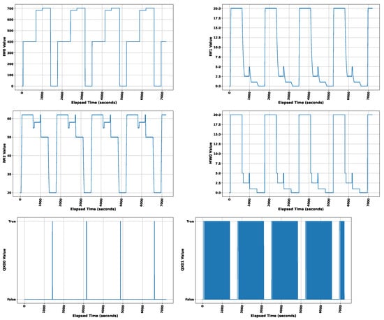 The initial step involves enumerating registers to identify (i) discrete input contacts and analog input registers (which may contain current measurements of physical variables) and (ii) discrete output coils and analog output holding registers (which may contain actuator commands). This task aims to compile a list of actively utilized registers and their corresponding data types (Boolean or numerical values). By scanning the Modbus address range, we map out the registers in use and identify those that respond to queries. It should be noted that certain registers may appear active even if their values never change; these are filtered out in subsequent stages. It should be noted that the underlying principle of our solution is based on querying the system for process-related data, regardless of the specific communication protocol used; for example, whether the system employs Modbus, DNP3, OPC UA, or another protocol, the critical aspect is the ability to access the PLCs and collect data from them. Figure 4 illustrates the values recorded over six hours for each register of the mixer PLC. This task ends by discovering the data type of the different registers (see Table 1).