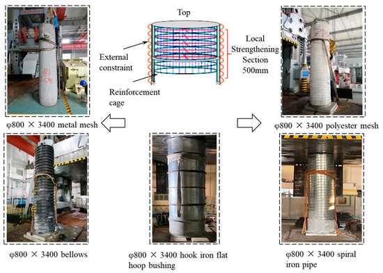There are six types of external restraints used in columns: unrestrained (N), metal mesh (M), polyester-fiber mesh (P), corrugated pipe (B), hooked iron-sheet flat-hoop sleeve (H), and spiral iron pipe (S).