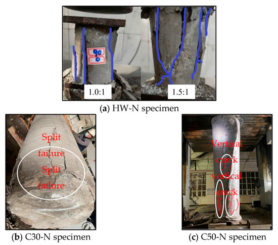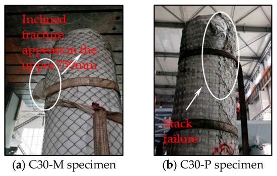 For unconfined concrete pillars, at the initial stage of loading, the load is small, and there is no obvious change in the surface of the specimen. When the load increases to 80% of the ultimate load, vertical cracks appear on the middle surface of the pillar. With the further increase in load, cracks widen and rapidly extend to the end of pillars. When the ultimate load is reached, the specimen is destroyed, and some concrete falls off. Finally, vertical splitting failure and oblique shear failure occur along the main crack, and the typical failure modes are shown in Figure 2b,c.
