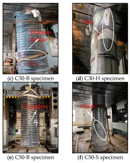 For the specimens of concrete pillars with external constraints, the performance is similar to that of unconstrained concrete pillars at the initial stage of loading. With the increase in load, the transverse deformation of the concrete column begins to increase, and the external constraint produces circumferential stress, which strengthens the constraint effect on concrete. The core concrete is in a three-dimensional compression state, but the overall deformation of the specimen is not obvious at this time. When the ultimate load is reached, the metal mesh wire at 0.75 m on the upper part of the concrete pillar restrained by the metal mesh is broken, the inner part of the column is inclined to break, the external structure is damaged and bulged, and some concrete is compressed off (Figure 3a). The inner part of the concrete pillar restrained by polyester-fiber mesh is obviously broken at 1.0 m above, accompanied by sound, and the outer-structure polyester-fiber mesh belt is broken, which shows stacking failure as a whole, and the failure process is relatively slow (Figure 3b). The external structure of the concrete pillar restrained by corrugated pipe is obviously damaged at 0.5 m in the upper part, and the internal structure of the pillar at 1.600 in the middle part is broken, accompanied by a sporadic breaking sound (Figure 3c). Compared with the concrete pillar with C50 filling medium under the same constraint conditions, only a slight slag drop occurs at the top during the whole loading process (Figure 3e), which shows that the filling medium is strong, and the bearing capacity of the pillar is greater. During the loading process, the top of the column begins to be destroyed. Because of the rigid restraint, the flat hoop breaks, and the iron sheet is torn apart, showing approximate rigid body failure (Figure 3d). The bearing capacity of the concrete pillar confined by the spiral iron pipe is the maximum. Under the ultimate load, the middle and lower parts of the casing produce non-penetrating compaction stacking cracks, and the integrity is good (Figure 3f).