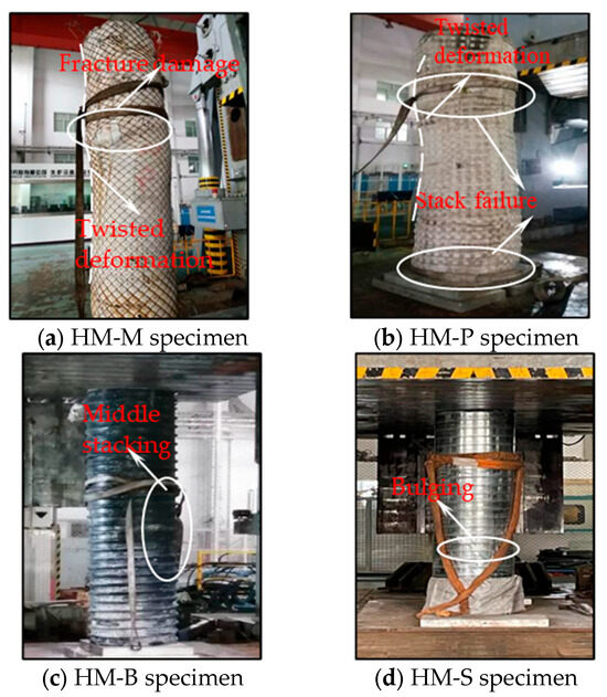 Figure 4 shows the final failure mode of the high-water material pillar under different constraint conditions. It can be seen from the figure that the specimen with metal mesh as an external constraint mainly shows fracture failure and distortion deformation, and inclined cracks can be observed during failure; thus, the specimen is seriously damaged and has basically lost its bearing capacity (Figure 4a). The specimens with polyester-fiber mesh and bellows as external constraints show overall drum deformation, and the external structure is damaged. The top and bottom of polyester-fiber mesh pillars are seriously stacked at 1.20 m (Figure 4b), and the middle and lower parts of bellows pillars are seriously drum damaged, and the pillars are bent axially (Figure 4c). The specimen with a spiral iron pipe as the external constraint has no obvious failure characteristics, except that the external structure exhibits a slight stacking phenomenon (Figure 4d).
