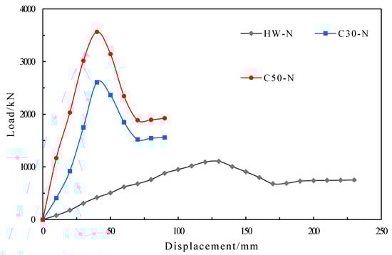 Under different constraints, the load–displacement curves of the three groups of specimens are different, as shown in Figure 6. The following can be seen from the figure:
