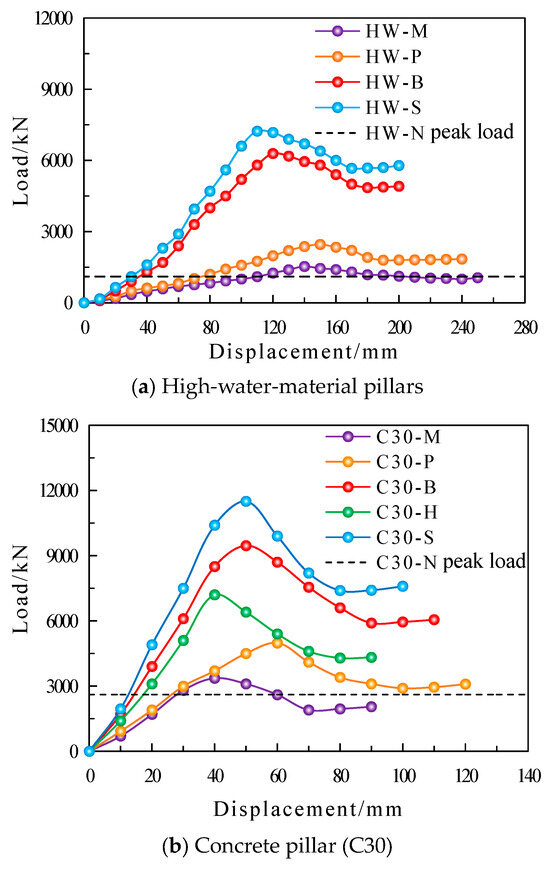 - By carrying out the bearing capacity test of 1:1 equal-ratio pillars, the conversion error of the bearing capacity caused by the size effect of high-water materials and concrete pillars is overcome. The results show that the bearing capacity of the 0.8 m × 3.4 m C30 concrete pillar is 2608 kN, 360 kN, 4980 kN, 7200 kN, 9460 kN, and 11,500 kN, respectively, under the conditions of unconstrained, diamond mesh, polyester-fiber mesh, hooked iron-sheet flat-hoop sleeve, corrugated pipe, and spiral iron pipe constraints, and the bearing capacity of the pillar is 2608 kN, 3360 kN, 4980 kN, 7200 kN, 9460 kN, and 11,500 kN, respectively. It can be seen that the external constraint capacity is enhanced, and the bearing capacity of the corrugated pipe pillar and spiral iron pipe pillar is 3.6 times and 4.4 times that of unconstrained concrete pillar, respectively.