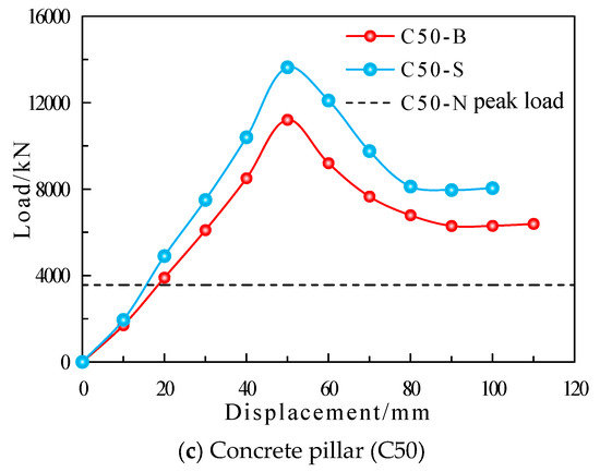 - The bearing capacities of the unconfined high-water material, C30 concrete, and C50 concrete are 1107 kN, 2608 kN, and 3565 kN, respectively. Compared with high-water-material pillars, the bearing capacity of concrete pillars is increased by 2.4~3.2 times. After the specimen reaches the ultimate load, the higher the strength of the filling medium, the faster the bearing capacity of the specimen decreases, and the worse the ductility. This is mainly because the higher the strength of concrete, the more obvious the brittle characteristics, which affect the overall ductility of the specimen.