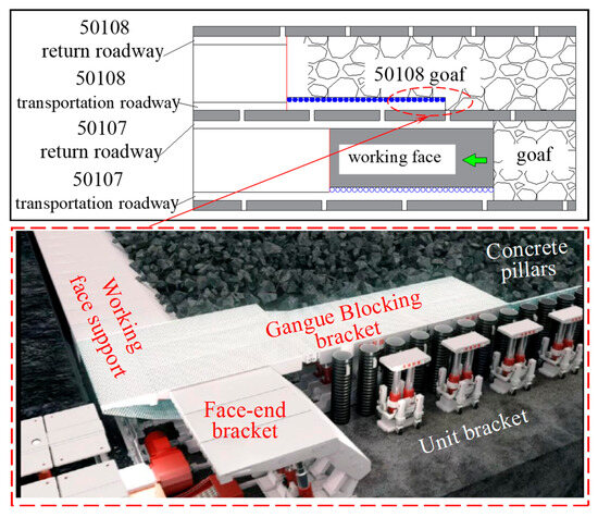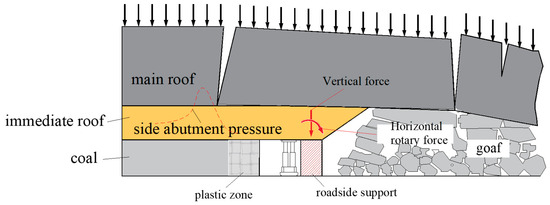 Roadside support is a support method which is set outside the roadway section to be reserved and on the side of a goaf. For simple conditions such as thin and medium–thick coal seams, shallow buried depths, and stable roofs, the direct roof of the working face can fall in time after mining, the hinged rock beam structure supporting the basic roof can quickly reach balance, and the support and strengthening support in the roadway can effectively maintain the stability of surrounding rock, so the roadside support may not be set. Except for this, roadway retaining along the gob-side entry generally needs to set up roadside support [1,2,3].