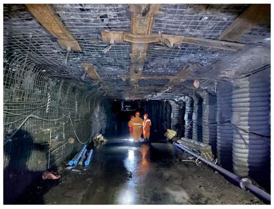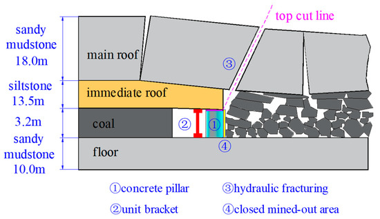 During the advancing process of the working face, the roof rock beam breaks continuously, and the basic roof rock stratum generally shows vertical subsidence and rotary deformation, which makes the solid coal side of the retaining roadway press and produce plastic deformation, and it also makes the side support of the roadway produce vertical stress and lateral stress formed by the rotary roof. The adequate strength of roadway support in time can effectively control the separation between the direct roof and the basic roof, and it can also effectively cut off the roof and promote the roof to collapse in the mined-out area. Reasonable roadway support has an obvious control effect on the deformation control of the surrounding rock and roof cutting in gob-side entry retaining. With the continuous advance of the working face, the surrounding rock deformation of the retaining roadway will continue to develop to the high-level rock stratum. Behind the working face, the retaining roadway will be subjected to the continuous deformation caused by the dynamic load of breaking and bending and sinking of the high-level rock stratum. The surrounding rock structure of roof and the performance parameters of the supporting body beside roadway retaining have great influence on the deformation control of the surrounding rock of roadway retaining [20,21,22,23].