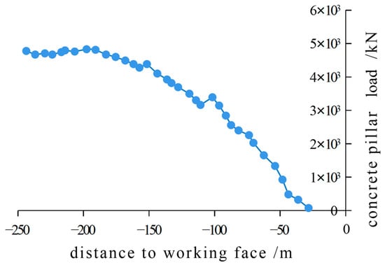 The load curve of the confined concrete pillar is shown in Figure 11. With the advancing of the working face, the load of the pillar shows a “gradual” process of first increasing and then stabilizing. The load of the concrete pillar increases continuously from the position of 25 m behind the working face. When the lag distance exceeds 180 m, the load of the pillar gradually stabilizes to 4800 kN, which is about 50% of the ultimate load of the pillar.