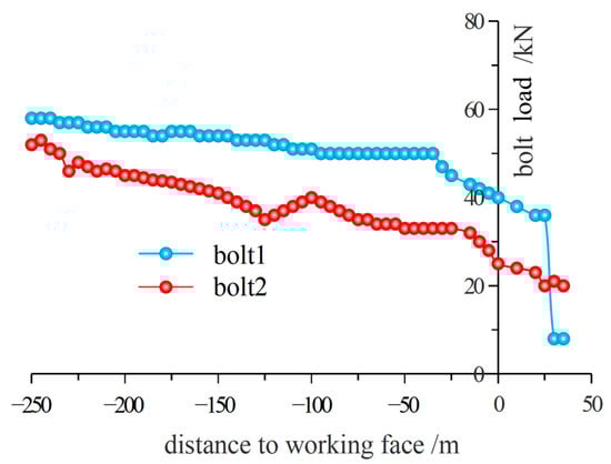 When the working face is about 25 m ahead, the load of anchor begins to increase gradually. When the working face is 30 m behind, the load growth rate of anchor becomes faster. When the working face is 200 m behind, the maximum load is 56 kN, which is obviously lower than the yield force of anchor rod of 85.2 kN, as shown in Figure 13.