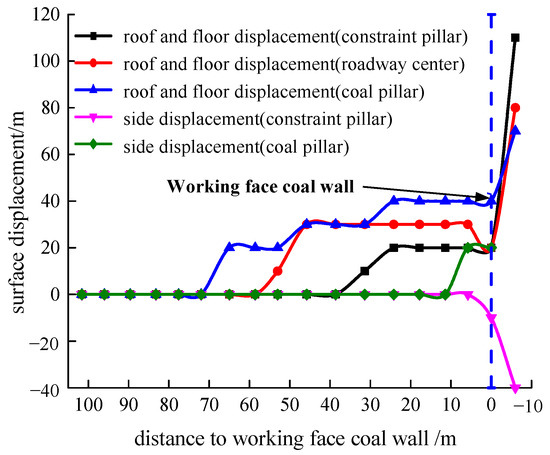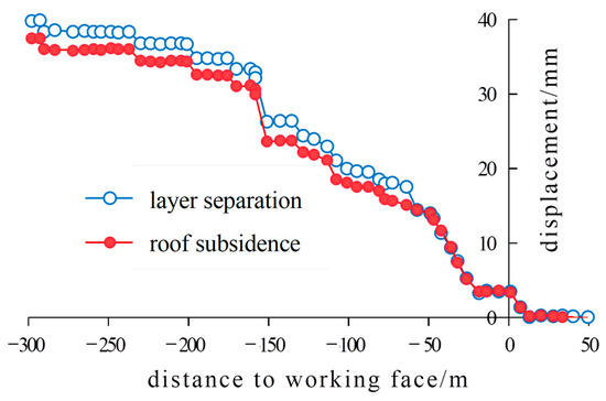 The displacement curve of the roadway surrounding rock during roadway retaining is shown in Figure 14. Roof subsidence and layer separation are small, within 20 m behind the working face, and then increase rapidly. The growth rate slows down within 50 m behind the working face. Then, the displacement increases slowly when it is 160 m behind the working face. The displacement tends to be stable when it is more than 200 m behind the working face, with the maximum layer separation amount at 38 mm, and no floor heave in the floor basically. The basic roof is effectively controlled. During the roadway retaining period, the subsidence and separation of the roadway roof are generally small, the surrounding rock of roadway is relatively stable, and the supporting effect is good.