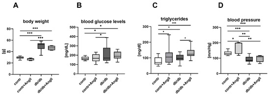 Box-plot graphs presenting the obesity-associated symptoms in the experimental groups vs. control at 19 weeks: (A) body weight; (B) blood glucose levels, (C) triglyceride serum levels, (D) blood pressure. Statistical analyses were performed with an unpaired Student’s t-test followed by Mann–Whitney correction (A), one-way ANOVA test (B–D); * p < 0.05, ** p < 0.002, *** p < 0.0002; number of animals in (A,B,D), as in the Materials and Methods section; number of samples in (C): control n = 14, control + Ang II n = 12, db/db n = 13, db/db + Ang II n = 10.