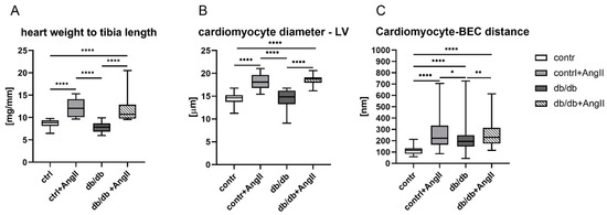 Cardiac hypertrophy was observed in the Ang II-treated control and Ang II-treated db/db mice compared to the control and db/db animals, as revealed by evaluation of the heart weight to tibial length ratio (Figure 3A). In the same groups, the cardiomyocyte diameters in the LV significantly increased, as revealed by morphometric measurements (Figure 3B). Moreover, the distances between the cardiomyocyte borders and the external blood endothelial cells (BEC) of the capillary walls were increased in the myocardium of the hearts of mice from all three experimental groups compared to the control, but especially in both groups of mice treated with Ang II (Figure 3C).