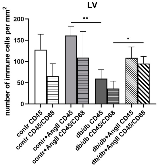 Of note, histopathological analysis indicated signs of cardiomyocyte injury visible as scattered clumps of eosinophilic material within the cytoplasm (Figure 4B) and the focal infiltration of inflammatory cells in the Ang II-treated animals (Figure 4B,C,G,H compared to Figure 4A,E). Remarkably, in areas devoid of granulation tissue and/or scars, macrophages of CD45+/CD68+ phenotype were less numerous in the LV of the db/db mice compared to the macrophage density in the Ang II-treated db/db mice (Figure 5), whereas the total number of CD45+ inflammatory cells (of CD45+/CD68+ and CD45+/CD68− phenotypes) was diminished in the db/db compared to the number in the Ang II-treated control mice (Figure 5). The density of macrophages (CD45+/CD68+) and other inflammatory cells (CD45+) was measured in areas devoid of scars and areas adjacent to coronary arteries.