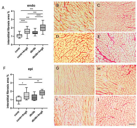 Interstitial fibrosis presented in the outer half (A–E), and inner half of the left ventricular wall (F–J). (A,F)—graphs showing the percentage of collagen deposits per total measured myocardial areas in all the experimental groups in the epicardial half (epi-) and the endocardial half (endo-) of the myocardial wall, respectively. Measurements were performed in areas without scars and without pericoronary fibrosis. Statistics—* p < 0.05, ** p < 0.02, *** p < 0.0002, **** p < 0.0001; number of tissue sections from each study group = 3; number of measurements: on average, 20 from every tissue section. (B–E,G–J)—panels showing interstitial collagen deposits in Picrosirius-stained histological sections; (B), (G)—control; (C,H)—contr + Ang II; (D,I)—db/db; (F,J)—db/db + Ang II; scale bar—100 µm.