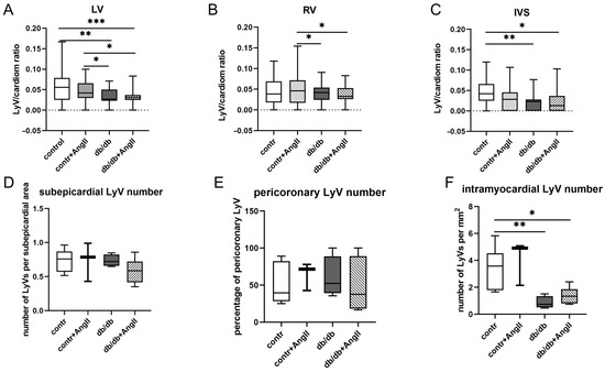 Density of cardiac lymphatic vessels presented as the ratio between the number of LyVs and the number of cardiomyocytes within a given area of the myocardium. (A)—the LV, (B)—the RV, and (C)—the IVS. (D,F)—presented as the number of LyVs within various cardiac locations: subepicardial (D), pericoronary (E), and intramyocardial (F) areas; pericoronary LyVs are calculated as the number of pericoronary LyVs to the number of all the cross-sectioned coronary arteries in a given tissue section (showed as percentage). The number of intramyocardial LyVs decreased markedly in only the db/db and Ang II-treated db/db mice compared to the controls and to the Ang II-treated control mice. Statistics—* p < 0.05, ** p < 0.02, *** p < 0.001; number of samples = 3—tile scan sections from each study group.