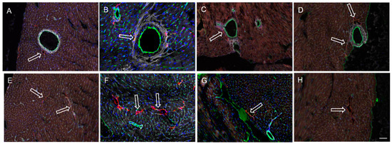 Confocal microscopy images of cardiac LyVs in the control, Ang II-treated control, db/db, and Ang II-treated db/db mice. (A–H)—confocal microscopic images of myocardial sections stained with anti-LYVE (red), anti-CD31 (green), Alexa Fluor 388-conjugated WGA lectin (white), Hoechst 33,342 for nuclei (blue); (A,E)—control; (B,F)—control + Ang II; (C,G)—db/db; (D,H)—db/db + Ang II; (A–D)—pericoronary LyVs; (E–H)—intramyocardial LyVs; scale bar—50 µm; abnormally shaped LyVs in db/db mice (C,G, arrows), pericoronary LyVs are embedded in the enlarged/hypertrophied adventitial tissue of coronary arteries (B,D arrows); LyVs in intramyocardial locations (F, white-edged arrows); pericoronary LyVs in Ang II-treated mice usually present open lumina (D, the white-edged arrow); number of tissue sections: 3–5 from each study group; scale bar—50 μm.