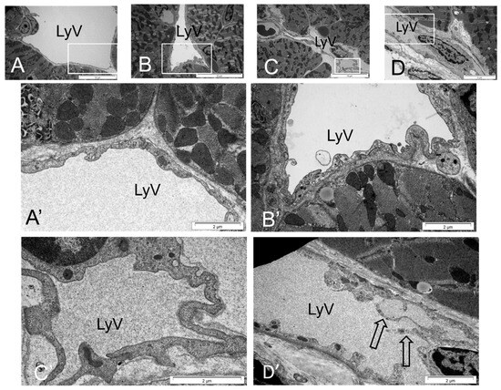 TEM analyses revealed details of the altered LyV wall shapes in the Ang II-treated control (Figure 9B,B′) and db/db mice (Figure 9C,C′) compared with the controls and with the contr + Ang II mice (Figure 9A,A′). The vessel walls in the myocardium of the db/db animals and in both Ang II-treated groups were wavy and undulating, in contrast to those observed in the control mice (Figure 9C vs. Figure 9A). Moreover, in the Ang II-treated db/db mice, long cytoplasmic processes protruding toward the vessel lumina were often visible (Figure 9D,D′). In addition, the overlapping flaps of the LECs were altered in the experimental groups vs. control, i.e., the flaps were often long and wavy, especially those projecting into the vessel lumen (Supplementary Figure S4B–D, vs. Figure S4A). The intercellular junctions of these flaps had larger gaps compared to those in the control mice (Supplementary Figure S4A vs. Figure S4B–D and Figure 10A).