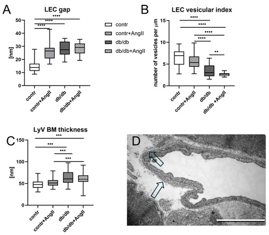 Ultrastructural characteristics of LyVs indicative of vessel leakage: widened gaps at intercellular junctions between the LECs—(A); decreased transcellular transport—(B); increased thickness of BM—(C) in experimental groups versus control; TEM image showing a multilayered BM adjacent to LyV wall in db/db mouse treated with Ang II—(D, arrows); scale bar—2 μm; number of samples from each study group, for (A–D) = 3, number of measurements—at least 20 from each sample. Statistics—** p < 0.02. *** p < 0.001, **** p < 0.0002.
