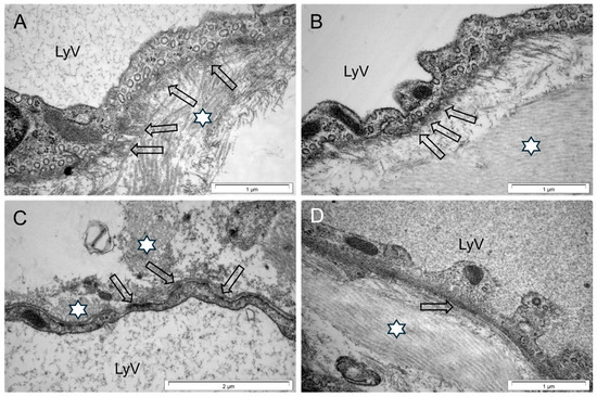 Contact of a LyV with the ECM via anchoring filaments. (A)—a LyV of a control mouse contacting with the ECM via clusters of short filaments (tufts) regularly distributed on the outer membrane of the LEC (arrow); (B)—control treated with Ang II with shorter filaments and irregularly oriented abnormal tufts, and a vessel wall surrounded by thick collagen deposits (asterisks) (B) arrows; (C)—db/db with odd-shaped AnchFs (arrows) separated by BM fragments (black arrows); (D)—db/db treated with Ang II with almost absent AnchFs (arrow) and thick collagen deposits (asterisk). Scale bars: (A,B,D)—1 µm; (C)—2 µm; number of samples—as in Figure 9.