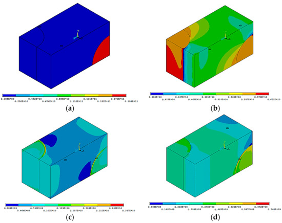 Distributions of equivalent stresses: (a) uniaxial stretching along the 0X axis; (b) uniaxial stretching along the 0Z axis; (c) shear in the XY pane; (d) shear in the XZ plane.