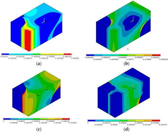 Distributions of equivalent plastic strains: (a) uniaxial stretching along the 0X axis; (b) uniaxial stretching along the 0Z axis; (c) shear in the XY pane; (d) shear in the XZ plane.