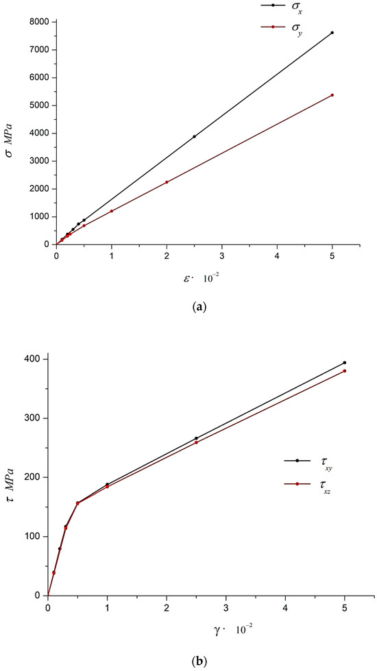The average values of coordinate stresses in all numerical experiments were determined in the postprocessor of the ANSYS program complex. The processing of results for the numerical solution of elastic–plastic problems is presented in Figure 4, which shows the calculated strain diagrams for stretching and shear.