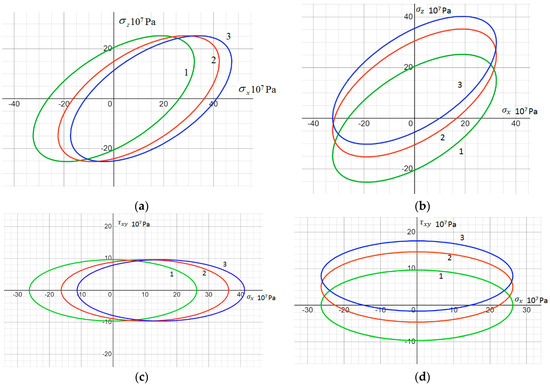 As a visual illustration of the shift in the plasticity surface, Figure 5 shows its sections by planes corresponding to two non-zero coordinate stresses, and , at different values of the back stress, (0—line 1; 107 Pa—line 2; 1.5 × 107 Pa—line 3).