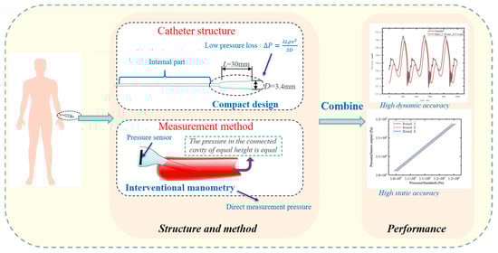 This paper proposes a high-precision interventional pressure measurement catheter with a compact structure for in vivo pressure monitoring. This catheter uses a minimally invasive testing method, and the proposed compact structure reduces pressure loss caused by fluid movement inside the catheter, ensuring accuracy in dynamically varying pressure measurements. The paper conducts a theoretical analysis of the pressure transmission process inside the catheter, fabricates a prototype, and establishes both dynamic and static pressure testing systems. Through experimental research on the effects of the catheter’s dimensions on the accuracy of dynamically varying pressure measurements, it demonstrates that the compact pressure measurement catheter can effectively enhance the precision of dynamically varying pressure measurements. The catheter offers high precision, small size, and simple manufacturing processes. It holds promising applications in fields such as in-body pressure measurement and microfluidic system monitoring.