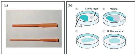 The manufacturing process of the pressure measurement catheter body is shown in Figure 4b: Firstly, carry out the mixing process as shown in Figure 4b. Add PDMS (Sylgard 184; Dow Corning) and curing agent to the container in a mass ratio of 5:1, and then stir thoroughly to ensure that the crosslinking reaction of the mixture occurs fully during the curing stage, ensuring the quality of curing. Second, remove the bubbles from the mixture. Place the bubble-filled mixture into the vacuum drying oven shown in Figure 4. The vacuum oven should have a pressure difference greater than 0.07 MPa from the external atmosphere, and the bubble extraction time should be 15 min per cycle, repeating three times to ensure all bubbles are completely removed from the mixture. Third, proceed with the casting and complete the curing process. At temperatures between 25 °C and 120 °C, the PDMS macromolecules undergo cross-linking reactions to form a network structure, resulting in a transparent elastic solid [30]. The catheter is prepared with a PDMS to curing agent ratio of 5:1.