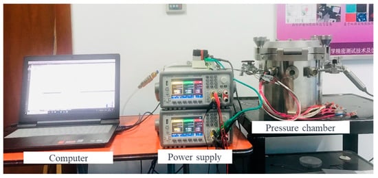 As shown in Figure 5, the schematic diagram of the high-precision static testing system comprises hardware and software components. The ability to achieve rapid, high-precision pressure control primarily depends on the system’s hardware performance, which includes a pressure chamber, pressure regulation module, controller, and signal output module. The overall functionality of the system is primarily determined by the software, which was developed using the C++ programming language to enable fully automated testing. This includes a program control module, data acquisition module, and data processing module. The pressure adjustment process is achieved through a cascaded control system, composed of two pressure regulation modules of different precisions. By adjusting the control program parameters, the system can reach the desired pressure value within 30 s and perform automatic testing of the pressure sensor. The physical system photo is shown in Figure 6.
