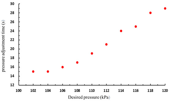 To validate the system’s control accuracy within the human body’s pressure range, an average of 11 desired pressure values was selected within a range of 100–120 kPa. Three pressure cycle controls were then conducted. Based on the actual pressure measured in the chamber by the reference pressure sensor, the experimental data are shown within the pressure adjustment range of 100–120 kPa, and the maximum deviation between the measured chamber pressure values and the desired pressure values is 1 Pa. The test results indicate that this system has high pressure control accuracy and good reliability. Furthermore, as shown in Figure 7, the time taken to adjust the chamber pressure from atmospheric pressure to any desired pressure point does not exceed 30 s. In conclusion, the results demonstrate that the performance of this system meets the requirements for static pressure performance testing in this study.
