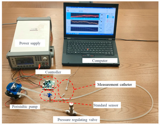 Using the prototype of the pressure measurement catheter and the dynamic testing system, the dynamic measurement accuracy of the compact pressure measurement catheter can be evaluated. The experimental process is as follows: The experimental system’s tubing is filled with saline, and the front end of the pressure measurement catheter is introduced into the circulating tubing to simulate the actual use environment. A stepper motor peristaltic pump is started to mimic the human heartbeat process.