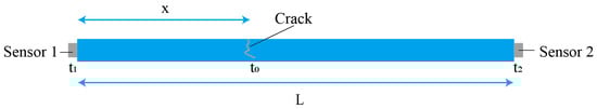 x is the distance from the crack to sensor 1, where x represents the position of the acoustic emission source, L is the length of the detection section, c is the wave velocity, represents the time when the crack begins to form, represents the time when sensor 1 receives the signal and represents the time when sensor 2 receives the signal.
