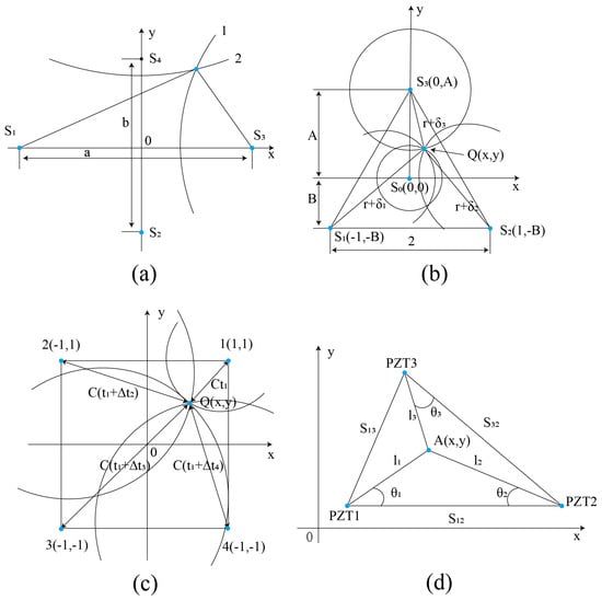 Positioning methods based on time difference method: (a) rhombic AE localization method []; (b) normalized square localization method []; (c) planar square–triangle localization method []; (d) triangular time-difference localization method with known velocity.