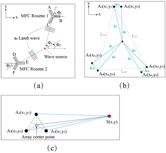 Langenberg et al. [] achieved sound source localization in plates by arranging the sensors in a rosette array. This method requires the propagation direction to coincide with the main strain direction without knowing the wave velocity (Figure 7a). Ciampa et al. [,,] measured the wave stress differences at six piezoelectric sensors, as shown in Figure 7b, used continuous wavelet transform to determine the bending Lamb wave arrival times, and then solved the nonlinear equations to obtain the coordinates of damage location and bending wave velocity by combining backtracking techniques related to global line search and local Newton iterative methods. Aljet et al. [] achieved damage localization on carbon-fiber-reinforced composite panels by combining arrival times and wave mode analysis from the data acquired by three closely spaced sensors, as shown in Figure 7c. Jiang et al. [] investigated the effect of various rosette configurations, including 45° rectangular, 135° rectangular, 60° delta and 120° delta, on the accuracy of wave propagation direction estimation. The results showed that the 135° triangle configuration provided the superior results and that the errors depended on the size and position of each sensor in the rosette.