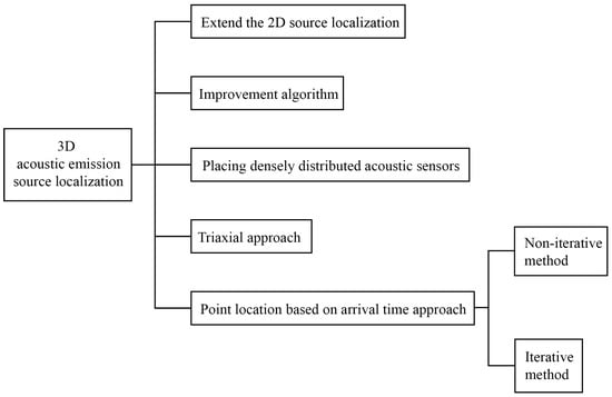 The localization of sound sources in three-dimensional structures is relatively complex and can be roughly divided into the following methods, as shown in Figure 9. The summary of three-dimensional acoustic emission source localization methods is shown in Table 1.