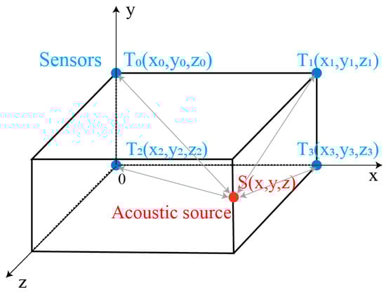 The most classic two-dimensional positioning method is the time difference method. The time difference localization method in three-dimensional structures first assumes that the sound velocity is known and constant. By calculating the distance difference between the sound source and each sensor, the spatial coordinates of the sound source are determined (Figure 10).