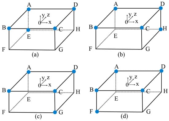 Although at least three sensors and two sets of time differences can determine the two-dimensional coordinates of the acoustic emission source, in order to obtain a single accurate solution, four sensors and three sets of time differences are often used to locate the acoustic emission source, such as in the four-probe rhombic localization method proposed by Shen et al. [], and the planar square-triangle localization method, shown in Figure 4a,c. The normalized square localization method proposed by Ma et al. [] is shown in Figure 4b. Although these acoustic emission source localization methods based on time difference require a small number of sensors, they are only applicable to materials with known constant velocity and isotropy.