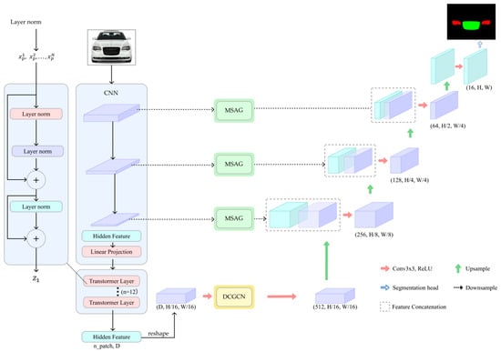 Therefore, this paper proposes MD-TransUNet, a semantic segmentation network integrating the multi-scale attention gate (MSAG) [] and the dynamic-channel graph convolutional network (DCGCN) [], based on the TransUNet model. The term ‘MD’ is an acronym for the MSAG and DCGCN modules, reflecting their combined role in enhancing the network’s performance. To enhance the edge continuity and overall definition of headlights and grilles, the MSAG module is integrated within the skip connections linking dual encoders and decoders, capturing multi-scale features to enhance detail sensitivity during reconstruction. This provides additional local specific information while suppressing irrelevant interference. The DCGCN module captures channel topological dependencies and aggregates effective features, enhancing information interaction and fusion between channels, thus addressing Transformer’s information loss during sequence encoding. Combining the MSAG and DCGCN modules effectively improves segmentation accuracy and generalization. By first performing image segmentation and then using the stable diffusion model for image restoration, design schemes are quickly generated, thereby improving design process efficiency and effectiveness, and providing a new technical approach for automotive design. The primary contributions of this paper are as follows: