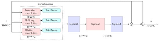 The MSAG module is integrated with skip connections to enhance the extraction of valuable features. To adaptively select features at different resolutions, three types of convolutions with varying receptive fields are used: 1 × 1 pointwise convolution; 3 × 3 ordinary convolution; and 3 × 3 dilation convolution. The 1 × 1 pointwise convolution is employed for linear transformation and dimensionality reduction, the 3 × 3 ordinary convolution is applied for detailed local feature extraction and enhancement, and the 3 × 3 dilation convolution is utilized to expand the receptive field by introducing strategic gaps, thereby capturing broader and more comprehensive feature information. By combining these convolution operations and applying batch normalization (BN), it is ensured that the resulting feature maps have uniform dimensions, facilitating subsequent feature fusion.