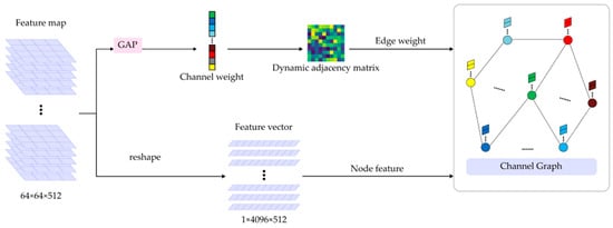 Prior to executing graph convolution, the feature map with dimensions 512 × 64 × 64 is converted into a graph. After global average pooling, the initial feature map is transformed into a comprehensive 512-dimensional column vector representation for further processing. To achieve a detailed understanding of the topological relationships among different image channels, the column vector is first processed using a specialized matrix activation function. Following this step, the learned parameter matrix is multiplied to obtain and improve the dynamic properties of the neighborhood matrix. Consequently, the derivation process of adjacency matrix is derived as follows: