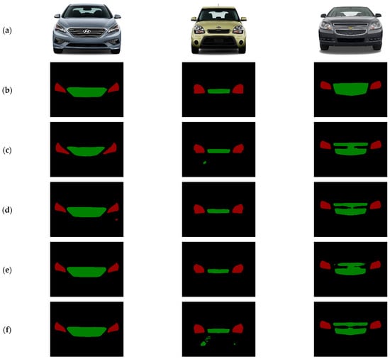 In this study, to thoroughly assess the effectiveness and robustness of enhanced networks in segmenting headlights and grilles from car front images, comprehensive experiments were carried out using the dataset detailed in Section 3.1. Six deep learning-based segmentation networks were selected for comparison: DeeplabV3+ [], DNLNet [], SegFormer [], PSPNet [], Segmenter [], and TransUNet []. The results, shown in Table 1, indicate that MD-TransUNet achieved mFscore, mIOU, and OA values of 95.81%, 92.08%, and 98.86%, respectively, outperforming all the compared models. Figure 4 displays the visual segmentation maps of the improved network and the other six networks for the headlights and grilles.