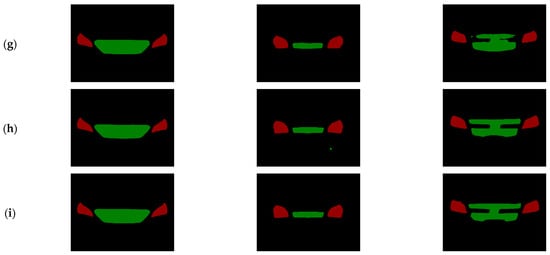 Comparison of the segmentation results of different algorithms on the automotive front face dataset. (a) Original Image; (b) Labeled Image: (c) DeeplabV3+; (d) DNLNet; (e) SegFormer; (f) PSPNet; (g) Segmenter; (h) TransUNet; and (i) MD-TransUNet.